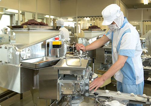 包餡機で餡を生地で包み込む作業です。検査者が形や重量を確認し、微妙な調整をしながら、包餡機を注意深く動かします。